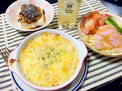 今日の晩ご飯 エビグラタン ハムサラダ なめたけと塩昆布の冷奴 ハイボール 昨日は鍋で今日はグラタン あったか料理が続いてます 別に昨日も今日も寒かったわけ違うけど(笑) グラタンはホワイトソースを別に作らずに フライパンにぜーんぶの材料を放り込んで作ったよ マカロニもそのまま入れて牛乳グラタン by しおとも いつもこのレシピの作り方を 参考にさせてもらってます( *´艸`) ただ今日は小麦粉がだまになったり マカロニが早ゆで用だったので 伸びた感じになったり&he...