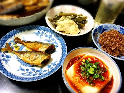 ここ3日間の晩ご飯 まずは一昨日の分 アジの南蛮漬け インゲンと玉子の炊いたん 糸コンニャクの明太バタ−炒め 韓国風冷奴 ハイボール 下処理済みのアジが売ってたので 南蛮漬けにしたよ( ´∀` ) インゲンは冷食のを使って簡単に♪ 次は昨日の分 カニ味噌 アジの南蛮漬け 焼きナス マカロニ玉子サラダ ハイボール ナスは生姜醤油で食べたよ 南蛮漬けは昨日の残りね サラダはお惣菜 カニ味噌は缶詰 きゅうりにのっけて食べたよ 次は今日...