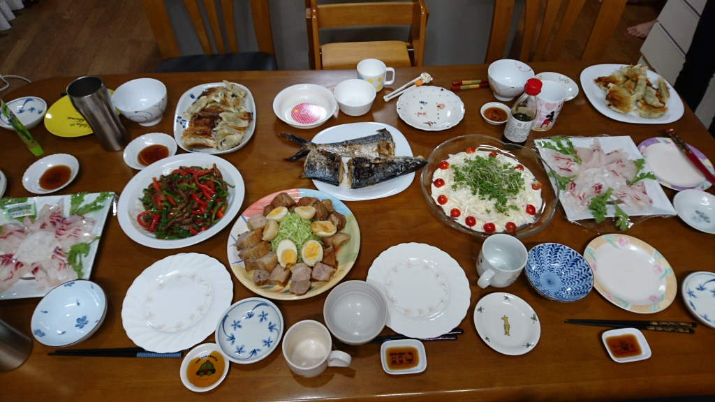 JUGEMテーマ:今日の晩ご飯 フネでございます。こんばんは! 今日は身体のメンテナンスのため 1日お休みをいただいておりました。 午前中病院へいき、午後は美容院へ行く予定でしたが、ワカメと旦那様が夕食を食べにくるというので、美容院は予定をずらしました。 左側から、鯛とイカの刺身(マスオさんが持って帰ってくれました)、チンジャオロースー、豚角煮(サザエ)、鰆塩焼き(マスオさん)、ホタテと大根のサラダ、餃子。 みんなで一緒に食べる...