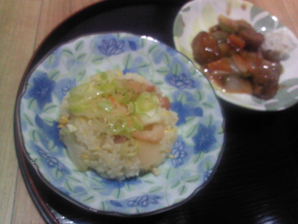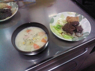 JUGEMテーマ:今日の晩ご飯 今日はクリームシチュー−と焼肉と唐揚げを作りました。 クリームシチューのルーはハウスの北海道シチュークリームを3つ使用。肉の変わりに冷凍のエビ・イカミックス使用しました。水450cc、固形のコンソメの素(1個で水300ccに溶かす物)1/3使用。15分煮込む所を10分にしました。余っていた冷凍のコーンも入れました。エビ・イカミックスはフライパンで炒めてから煮込みました。牛乳80ccにしました。最後にバジルを振りかけました。