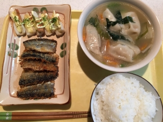 JUGEMテーマ:今日の晩ご飯 昨日の晩ご飯です。 スープ餃子は市販のやつ買いました。 (ダシ付きのやつ) でも野菜はたっぷり取れるように、いろいろ入れましたよ。 秋刀魚のパン粉焼は、 私は秋刀魚を普通に食べたいんですけど、 子供がね、あんまり食べてくれなくて。 で、考えたのがこれです。 三枚におろした秋刀魚を買って来てます(手抜き) それにマヨネーズを塗って、パン粉をつけます。 フライパンに多めの油で、揚げ焼にして出来上がり。 簡単で、子供もこれなら結構食べてくれるんです。...