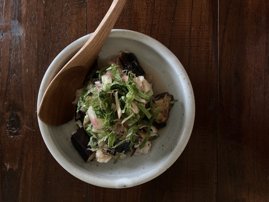 夏らしい一品、なすのおろし和え。 最近は夏野菜を使うことが多く、レシピは夏井景子さんの“メモみたいなレシピ"で作る家庭料理のレシピ帖から。 夏井景子さんのレシピは季節の野菜をふんだんに使ったものが多い。 そして私にしては斬新なレシピも多く、コレとこれの組み合わせ!?と驚くものもあるが作って食べてみると、 美味しい〜!また作ってみよう!という感動が多々あります。 毎日の料理作りの世界が広がるのは嬉しい! うつわはかじや窯の糠釉6寸鉢。 わが家ではか...