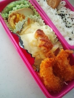 JUGEMテーマ:いつものお弁当昨日が17歳の誕生日だった娘チャン1号学校から帰って来ると大きな袋を抱えてた部活の人たちから プレゼントを貰ったそう^^クッショッンやマンガ本の他はお菓子がいっぱい!!!!みんなバラバラに買ってくれてるはずなのに不思議とカブってるものが1つもなかった(*^▽^*)しばらくは 楽しめるね〜♪・エビフライ・ポテトグラタン(自家製ジャガイモ)・味付き煮卵・ちくわ磯辺(冷食)昨日のパーティーメニューの名残弁当だからいつもよりもチョッとだけ豪華かな??(笑)