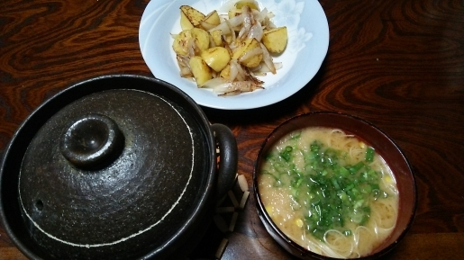 ついにご飯がなくなったので久しぶりに土鍋で炊いた(;´∀`)おかずはジャガイモと玉ねぎを塩コショーで偏り野菜炒めとそうめん入りの味噌汁(笑)