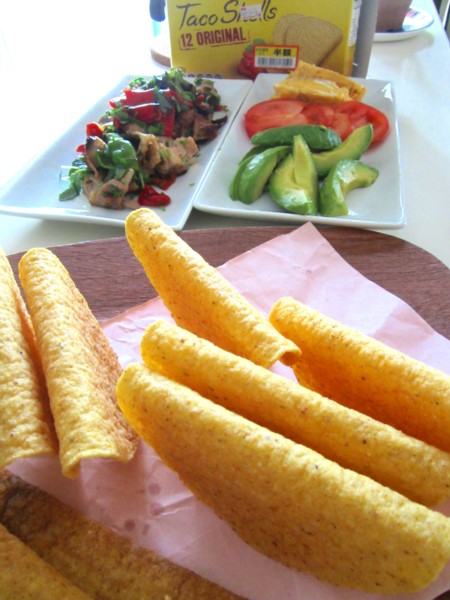 JUGEMテーマ:男の料理 ライフでまたしてもタコシェル半額 2つ買っといたシーズニング(メキシコ調味料)も無かったんで とりあえずシェルを美味しく食べるには?を基本に 具をあるもんで作った。トマト、玉子焼き、アボガド鶏ももの塩焼き、焼きパプリカ、みつば 変な取り合わせやけど あるもんで作った塩コショウ マヨネーズ味 ポイントは、タコシェルはしっかりチンすることかな 焦げる寸前がナイス熱いので火傷注意 ほんまに熱いです。今日は、庶民の味方 値引き半額食材でリッチなランチ タコシェル料理でした。