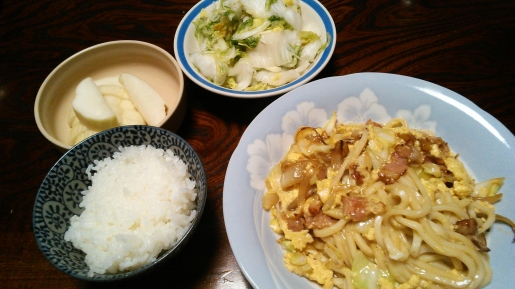 体が全身筋肉痛状態で心身ともにヘロヘロ(´д`)前も同じようなこと言ってるな・・・・でも、食わなきゃ死ぬ!で、今日の晩飯は。。。。ごはんと各種漬物と。。。玉ねぎとシャキシャキキャベツとベーコン入り うどんの偽カルボナーラ!なんじゃそりゃヽ(`Д´)ノ