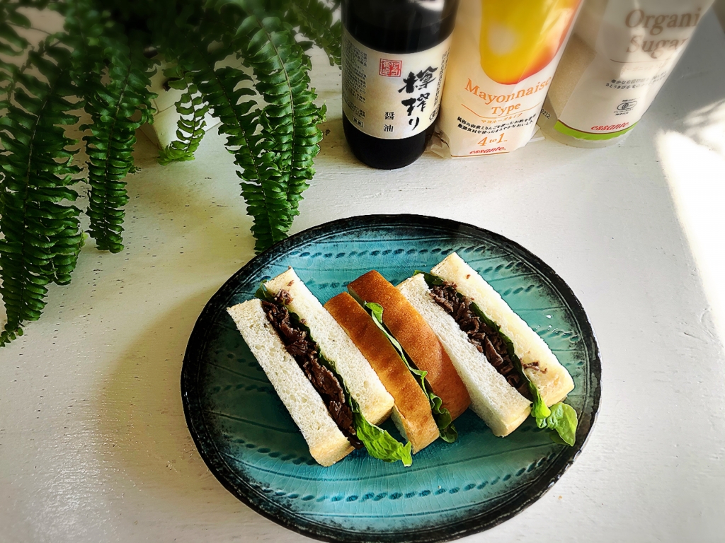 JUGEMテーマ:毎日の簡単1品 こんにちは〜♪ 今日は〜焼き肉をサンドイッチで頂きます〜♪ [ PR ] それでは材料です〜⇩⇩⇩ 食パン(厚みはお好みで)・・・4枚 牛肉薄切り・・・100g サンチュ・・・2枚 ★12ヶ月の食卓樽搾り醤油・・・大さじ1 ★本みりん・・・大さじ1 ★酒・・・大さじ1 ★エサンテオーガニックシュガー・・・小さじ1 ★にん...
