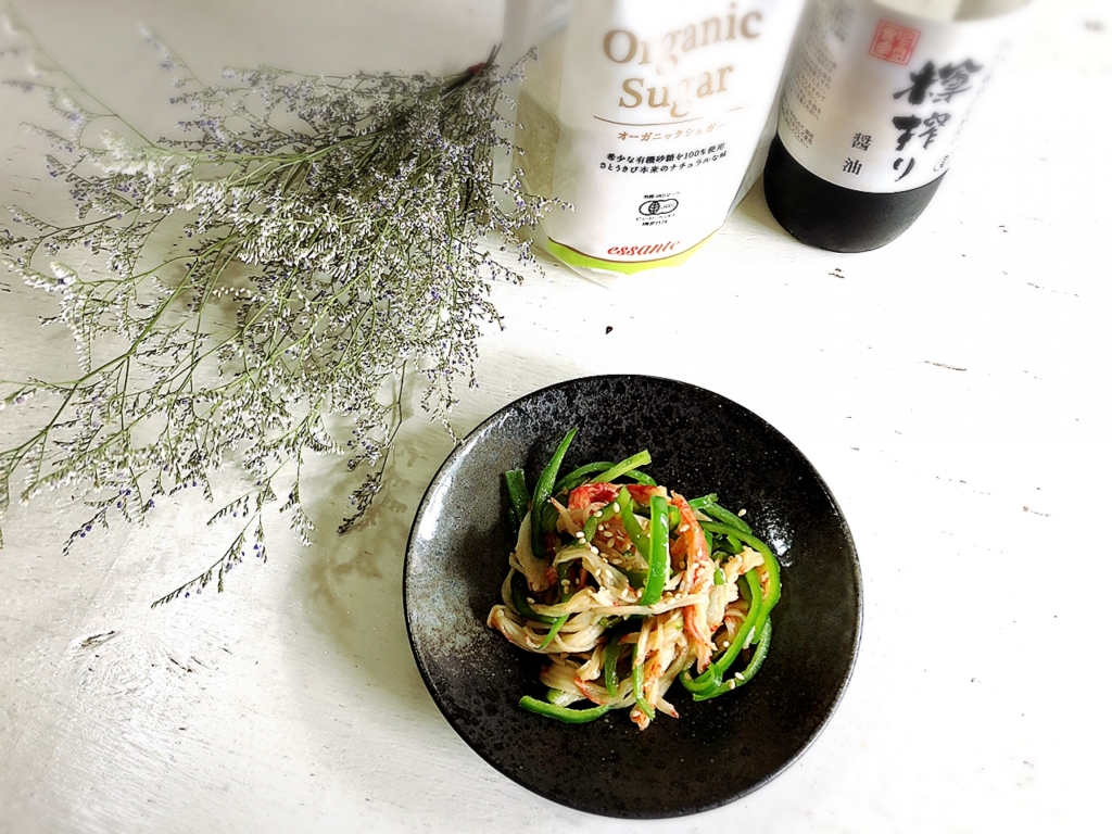 JUGEMテーマ:毎日の簡単1品 こんにちは〜♪ 今日は〜ピーマンを沢山食べれる簡単炒め物♪ [ PR ] それでは材料です〜⇩⇩⇩ ピーマン・・・5個 カニかま・・・1パック ★12ヶ月の食卓樽搾り醤油・・・小さじ2 ★エサンテオーガニックシュガー・・・小さじ1 白ごま・・・適量 エサンテ4to1脂肪酸バランスオイル・・・適量 以上です〜♪ &...