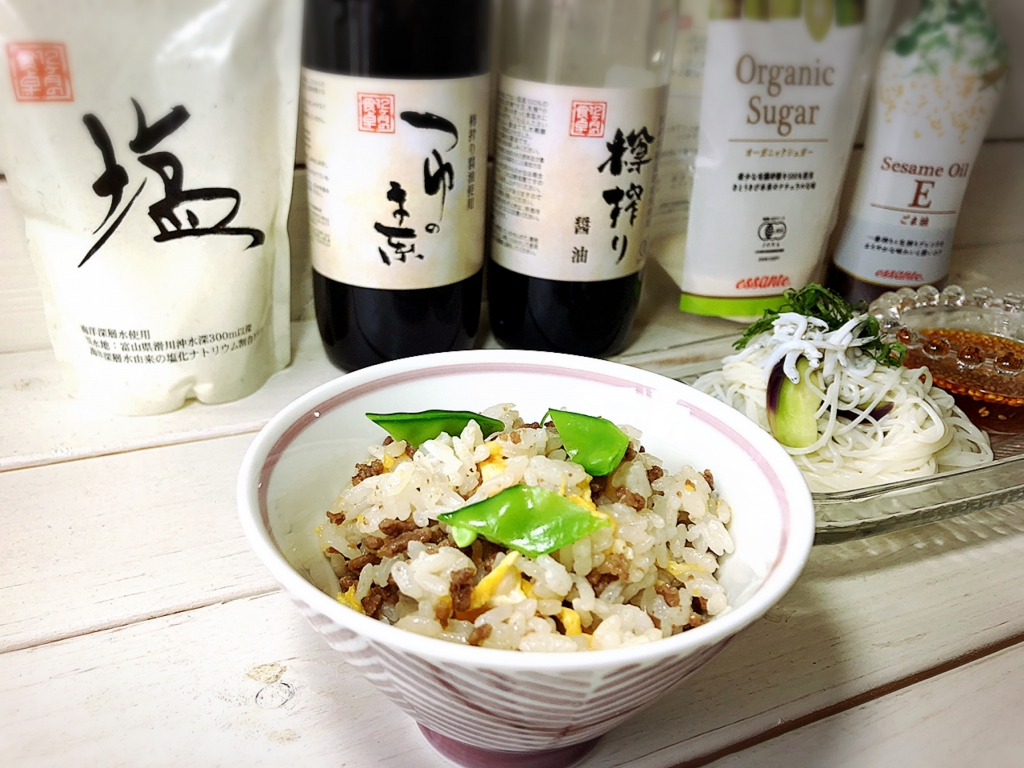 JUGEMテーマ:毎日の簡単1品 こんにちは〜♪ 今日は〜お子様も大好きな牛そぼろと炒り卵の混ぜご飯♪ それでは材料です〜⇩⇩⇩ 牛挽肉・・・150g 溶き卵・・・2個 ○12ヶ月の食卓塩・・・少々 ○エサンテオーガニックシュガー・・・小さじ1 きぬさや・・・適量 炊きたてご飯・・・1.5合 ★エサンテオーガニックシュガー・・・大さじ1と1/2 ★12ヶ月の食卓樽搾り醤油・・・大さじ1と1/2 ★酒・...