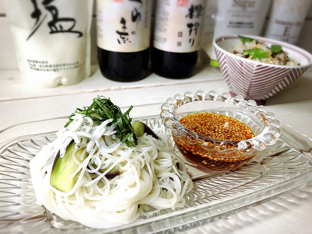 JUGEMテーマ:毎日の簡単1品 こんにちは〜♪ 今日は〜茄子とシラスでピリ辛素麺♪ それでは材料です〜⇩⇩⇩ 素麺・・・2束 シラス・・・適量 茄子・・・1本 大葉・・・5〜6枚 ★12ヶ月の食卓つゆの素・・・大さじ2 ★浄水・・・60ml〜お好みの濃さに ★豆板醤・・・小さじ1 ★エサンテセサミオイル・・・大さじ1 ★白すりごま・・・大さじ1 以上です〜♪ それではL...