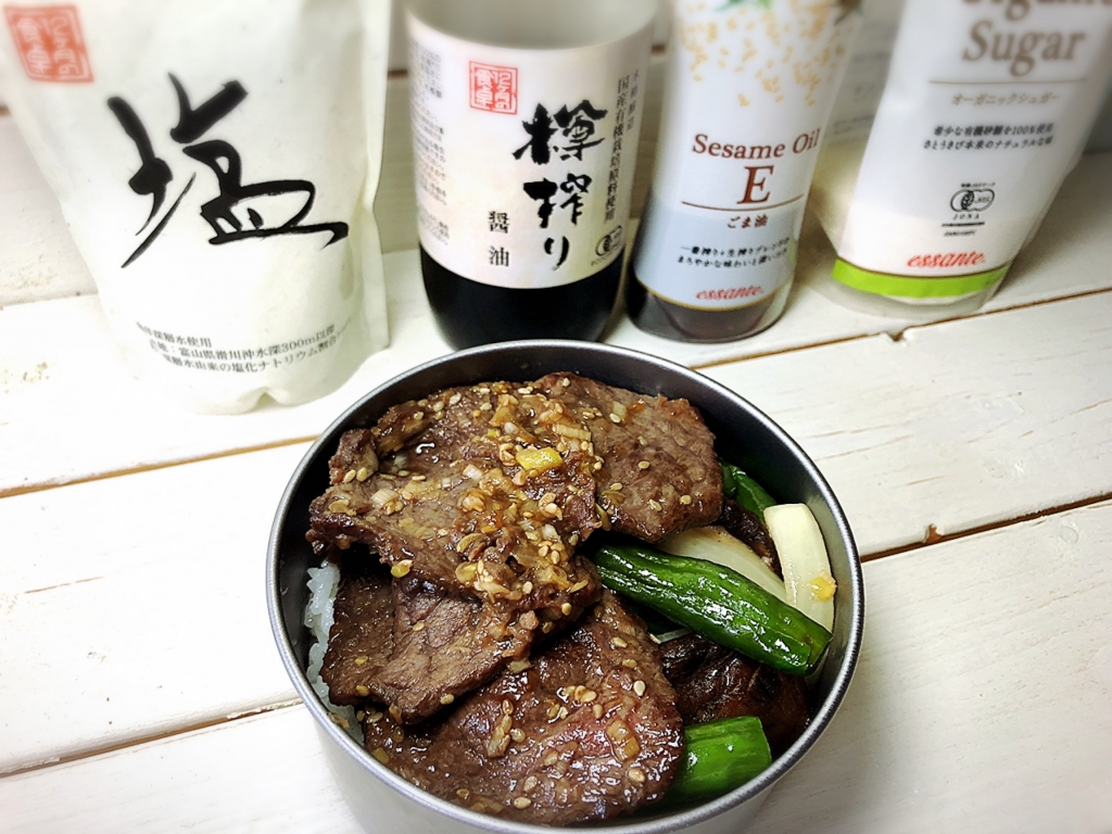 JUGEMテーマ:毎日の簡単1品 こんばんは〜♪ 今日は〜簡単和風焼き肉丼♪ それでは材料です〜⇩⇩⇩ 焼き肉用肉・・・400〜500g ★酒・・・大さじ1 ★本みりん・・・大さじ1 ★エサンテオーガニックシュガー・・・大さじ3 ★12ヶ月の食卓樽搾り醤油・・・大さじ1 ★にんにくすりおろし・・・大さじ1 ★白ネギみじん切り・・・1/2本 ★エサンテセサミオイル・・・大さじ2 ★白ごま・・・大さじ...