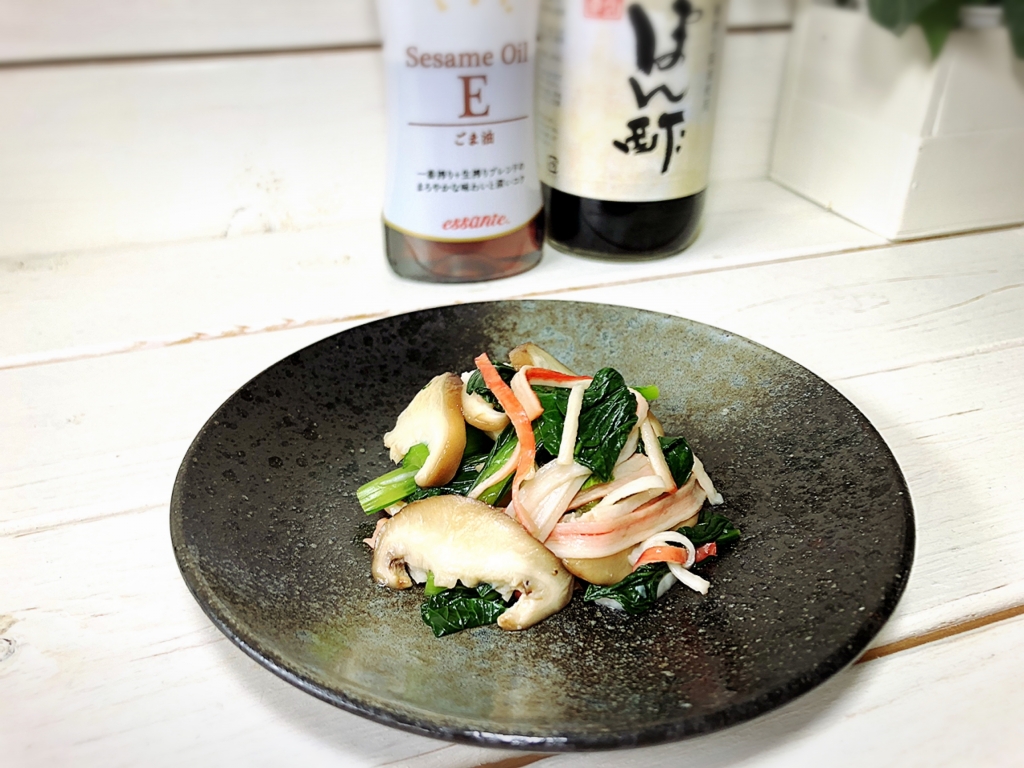 JUGEMテーマ:毎日の簡単1品 こんにちは〜♪ 今日は〜小松菜とカニかまでさっぱり和え物♪ それでは材料から〜♪ 小松菜・・・2〜3束 カニかま・・・1〜2本 椎茸・・・1個 ★12ヶ月の食卓ぽん酢・・・小さじ1 ★エサンテセサミオイル・・・小さじ1/2 ★レモン汁・・・少々 以上です〜♪ それではLet's cooking! 小松菜は浄水で洗い水がついたまま鍋へ入れ茹でます。 ※水気...
