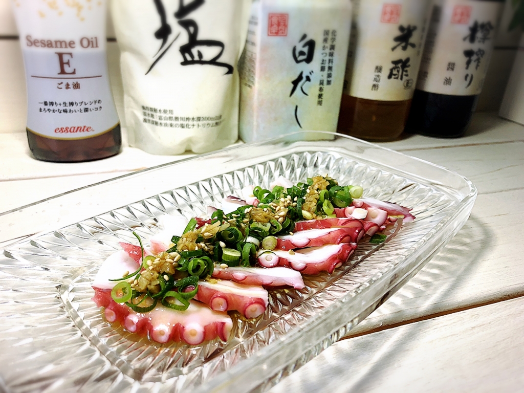 JUGEMテーマ:毎日の簡単1品 こんにちは〜♪ 今日は〜蛸で簡単おつまみ♪ それでは材料です〜♪ 茹で蛸・・・100g ※刺身用の生蛸でも 刻み葱・・・適量 ★にんにくみじん切り・・・1片 ★生姜みじん切り・・・1片 ☆エサンテセサミオイル・・・小さじ2〜 ☆12ヶ月の食卓樽搾り醤油・・・小さじ1 ☆本みりん・・・小さじ1 ☆12ヶ月の食卓米酢・・・小さじ1 ☆浄水・・・小さじ1 ☆12ヶ月の食卓白だし・・...