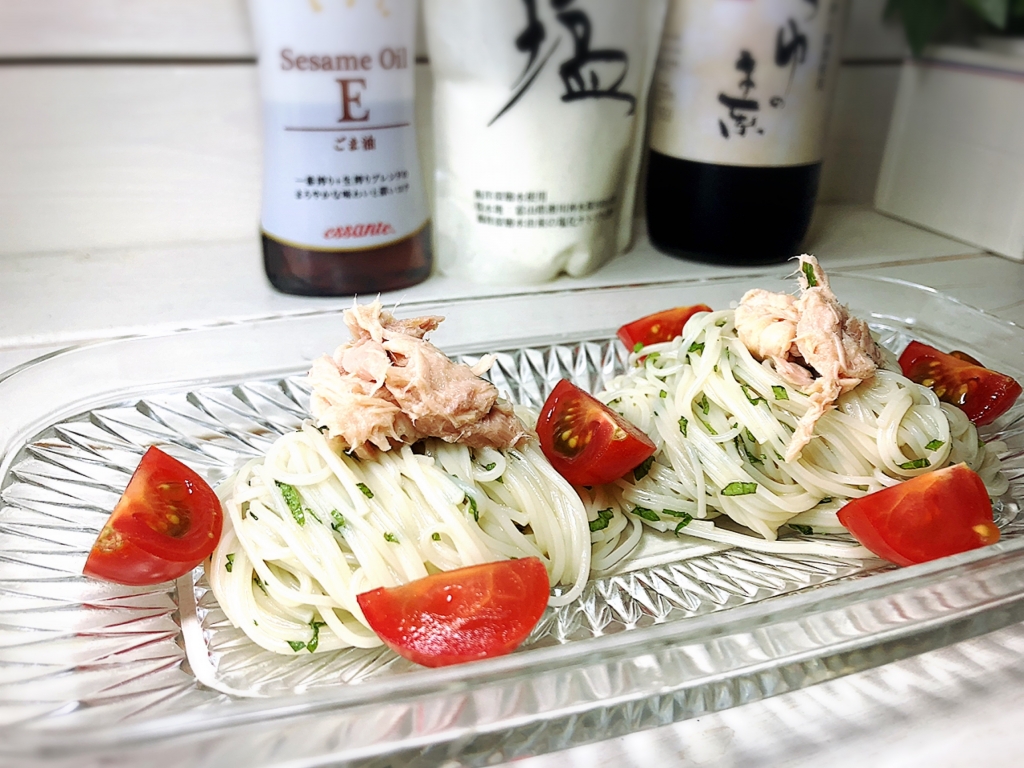 JUGEMテーマ:毎日の簡単1品 こんにちは〜♪ 今日は〜大葉の香りがとっても良い混ぜ素麺です〜♪ それでは材料です〜⇩⇩⇩ 素麺・・・1束 ★大葉・・・7〜8枚 ミニトマト・・・2個 ツナ缶・・・適量 ★12ヶ月の食卓つゆの素・・・大さじ1 ★エサンテセサミオイル・・・大さじ1 ★12ヶ月の食卓塩・・・適量 以上です〜♪ それではLet's cooking! 大葉を...