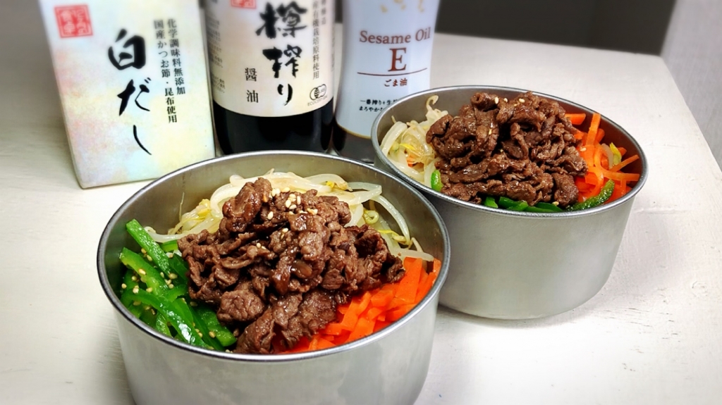 JUGEMテーマ:毎日の簡単1品 こんにちは〜♪ 今日は〜簡単ビビンバ♪ それでは材料です〜⇩⇩⇩ 牛肉薄切り・・・120g ピーマン・・・1個 人参・・・3センチ もやし・・・1/2袋 ☆12ヶ月の食卓白だし・・・小さじ1 ☆エサンテセサミオイル・・・大さじ1 ☆胡椒・・・少々 ★オイスターソース・・・小さじ1 ★12ヶ月の食卓樽搾り醤油・・・小さじ2 ★本みりん・・・小さじ2 胡麻・・・...
