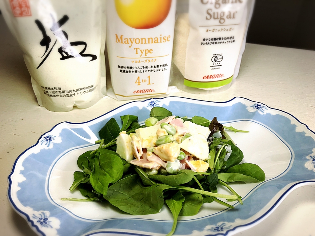 JUGEMテーマ:毎日の簡単1品 こんにちは〜♪ 今日は〜枝豆と卵とハムで爽やかサラダ♪ それでは材料です〜⇩⇩⇩ 枝豆・・・30g ハム・・・2枚 ゆで卵・・・1個 ベビーリーフ・・・1パック ★エサンテ4to1マヨネーズタイプ・・・大さじ2 ★プレーンヨーグルト・・・大さじ1 ★粒マスタード・・・小さじ1/2 ★エサンテオーガニックシュガー・・・少々 ★12ヶ月の食卓塩・・・少々 ...