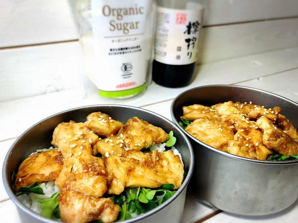 JUGEMテーマ:毎日の簡単1品 こんにちは〜♪ 今日は〜鶏胸肉で胡麻だれを使っててり焼き丼♪ それでは材料です〜⇩⇩⇩ 鶏胸肉・・・1枚 ★酒・・・大さじ3 ★12ヶ月の食卓樽搾り醤油・・・大さじ1/2 ★生姜搾り汁・・・小さじ1/2 かいわれ・・・1/2パック 片栗粉・・・適量 酒・・・大さじ1 ☆12ヶ月の食卓樽搾り醤油・・・大さじ3 ☆本みりん・・・大さじ2 ☆エサンテオーガニックシュガー・...