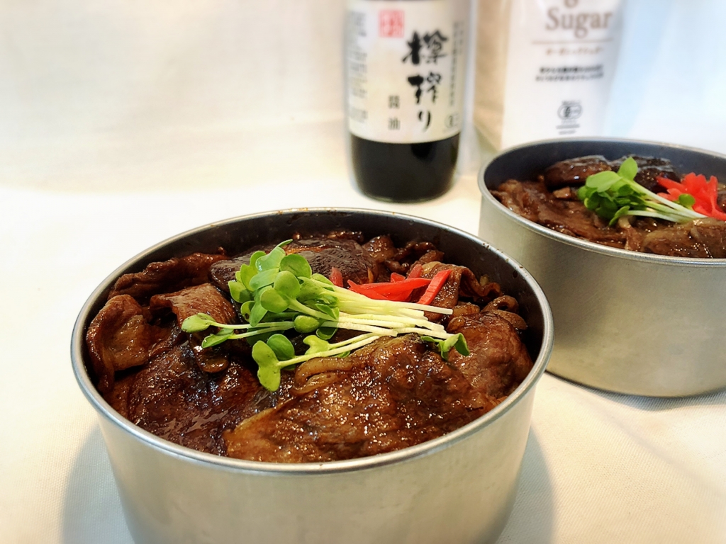 JUGEMテーマ:毎日の簡単1品 こんにちは〜♪ 今日は〜お弁当に〜今半風たれですき焼き肉丼です〜♪ 丼もの比率が高くて済みません💦 それでは材料です〜⇩⇩⇩ すき焼き用牛肉・・・150g 椎茸・・・2個 ★12ヶ月の食卓樽搾り醤油・・・50ml ★みりん・・・37ml ★エサンテオーガニックシュガー・・・15g 炊きたてご飯・・・丼2杯分 貝割れ・・・適量 紅ショウ...