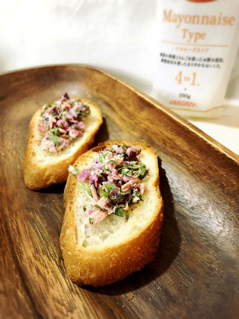 JUGEMテーマ:毎日の簡単1品 今日は〜和風なブルスケッタ♪ それでは材料から〜 バケット・・・1/2〜 バター・・・適量 粒マスタード・・・適量 ☆柴漬け・・・30g ☆ツナ缶・・・1缶 ☆大葉みじん切り・・・7〜8枚 ☆エサンテ4to1マヨネーズタイプ・・・大さじ2 ☆ブラックペッパー・・・適量 以上です! それではLet's cooking! ボールにみじん切りにした柴漬けとオイルを切ったツナ、みじん切りにした大葉、...