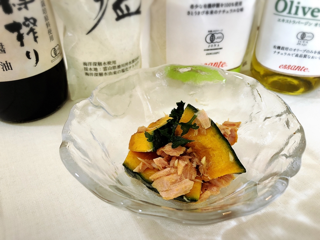 JUGEMテーマ:毎日の簡単1品 今日は〜かぼちゃとツナで簡単サラダ♪ ※写真に間違ってお砂糖が映ってますが今回は使ってません💦 それでは材料から〜 かぼちゃ・・・300g ツナ缶・・・1缶(80g) パセリ・・・少々 ☆にんにくみじん切り・・・1/2片 ☆レモン汁・・・大さじ1 ☆エサンテオーガニックエキストラバージンオリーブオイル・・・大さじ2 ☆12ヶ月の食卓樽搾り醤油・・・小さじ1/3 ☆12ヶ月の食卓塩・・・少々 ☆胡椒・...