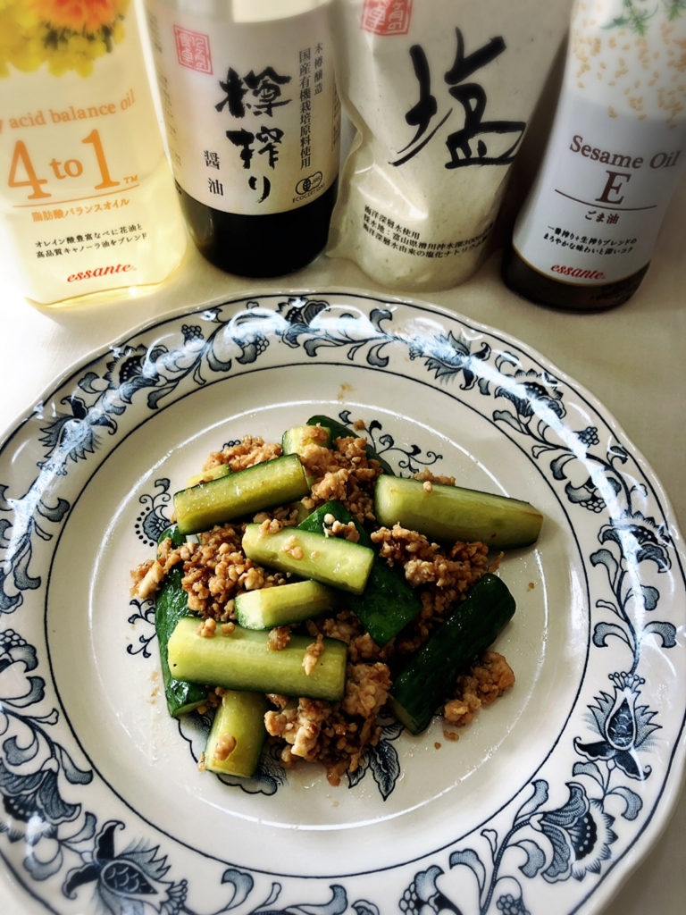 JUGEMテーマ:毎日の簡単1品 今日は〜胡瓜と鶏挽肉♪ それでは材料から〜 胡瓜・・・3本 鶏挽肉・・・150g にんにくみじん切り・・・1片 生姜みじん切り・・・1片 ☆12ヶ月の食卓塩・・・小さじ1弱 ☆オイスターソース・・・大さじ1と1/2 ☆12ヶ月の食卓樽搾り醤油・・・小さじ1 ☆粗挽き胡椒・・・適量 ☆蜂蜜・・・小さじ1 ★片栗粉・・・小さじ2 ★浄水・・・50ml エサンテ4to1脂肪酸バランスオイル・・・大さじ1 エサ...