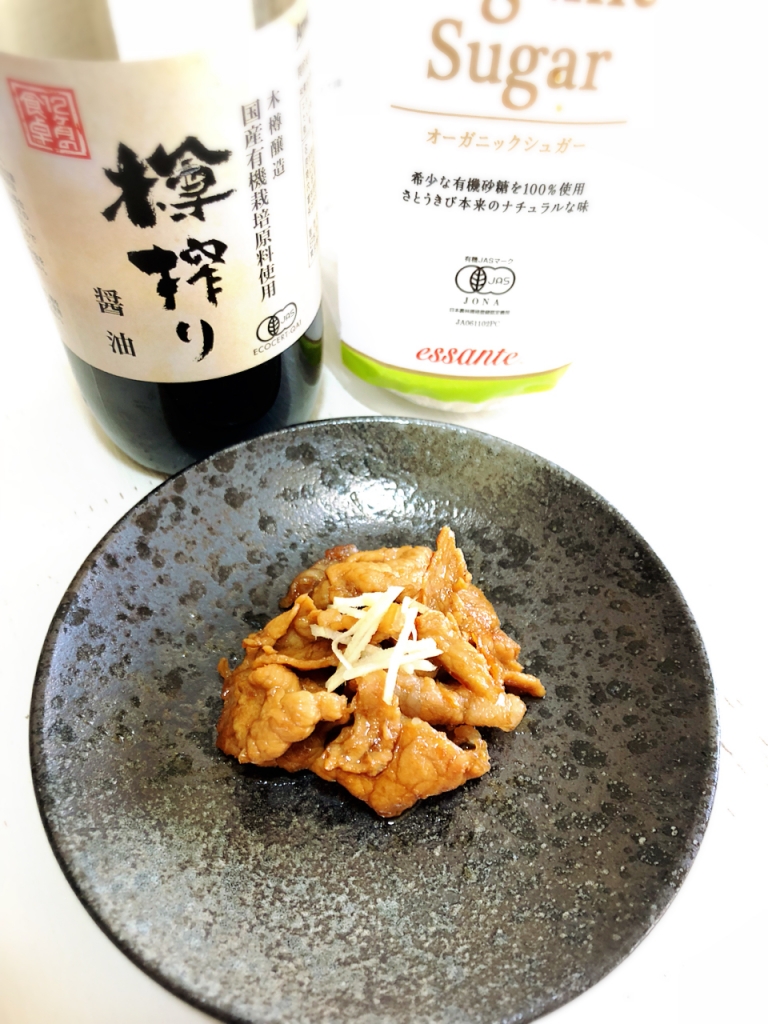 JUGEMテーマ:毎日の簡単1品 今日は〜豚肉♪ それでは材料から〜 豚肉薄切り・・・300g 生姜千切り・・・1片 ☆12ヶ月の食卓樽搾り醤油・・・35cc ☆酒・・・大さじ1強 ☆えさんてオーガニックシュガー・・・大さじ1 ☆みりん・・・大さじ1 えさんて4to1脂肪酸バランスオイル・・・適量 以上です! それではLet's cooking! 豚肉は一口サイズに切り、生姜は千切りに。 フライパンをイ...