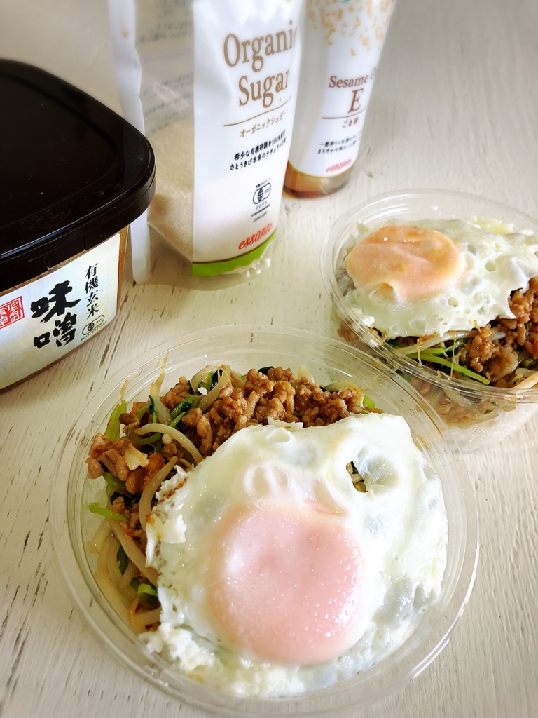 JUGEMテーマ:毎日の簡単1品 今日は〜ピリ辛肉味噌丼♪ それでは材料から〜 豚ひき肉・・・100g もやし・・・1/2袋 豆苗・・・1/2袋 ☆エサンテ4to1セサミオイル・・・小さじ1 ☆生姜擂り下ろし・・・小さじ1/2 ★12ヶ月の食卓玄米味噌・・・大さじ1 ★酒・・・大さじ1 ★エサンテオーガニックシュガー・・・小さじ2 ★豆板醤・・・小さじ1 水溶き片栗粉・・・各小さじ2 ご飯・・・2杯分 目玉焼き・・・2枚 以上です...