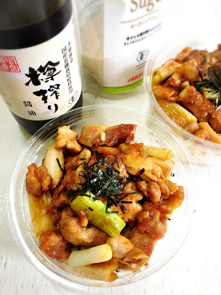 JUGEMテーマ:毎日の簡単1品 今日は〜鶏肉で丼弁当シリーズ♪ それでは材料から〜 鶏もも肉・・・1枚 長ねぎ・・・1本 ご飯・・・2杯分 刻み海苔・・・適量 一味唐辛子・・・お好みで ☆12ヶ月の食卓樽搾り醤油・・・大さじ2と1/2 ☆みりん・・・大さじ2 ☆エサンテオーガニックシュガー・・・大さじ1 以上です! それではLet's cooking! 鶏もも肉は皮を下にして横半分に切り、1〜1.5センチ間隔で切り...