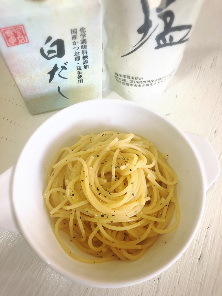 JUGEMテーマ:毎日の簡単1品 今日は〜簡単ワンポットパスタ♪ それでは材料から〜 エサンテスパゲッティーニ・・・150g 浄水・・・400cc 12ヶ月の食卓白だし・・・大さじ1〜1.5 12ヶ月の食卓塩・・・適量 バター・・・20g ブラックペッパー・・・適量 以上です! それではLet's cooking! 中フライパンに浄水、白だしを入れ沸騰してきたらパスタを半分に折入れる。 時間通り茹でる。  ...