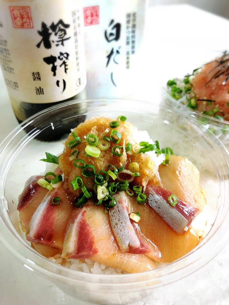 JUGEMテーマ:毎日の簡単1品 今日は丼シリーズぶりの漬け丼♪ ーーーーーーーーーーーーーーーーーー ーーーーーーーーーーーーーーーーーー それでは材料から〜 お刺身用ぶり・・・10〜12切れ ご飯・・・2杯分 ☆12ヶ月の食卓樽搾り醤油・・・大さじ1 ☆みりん・・・大さじ1 ☆酒・・・大さじ1 大根おろし・・・適量 刻み葱・・・適量 以上です! それではLet's cooking!  ...