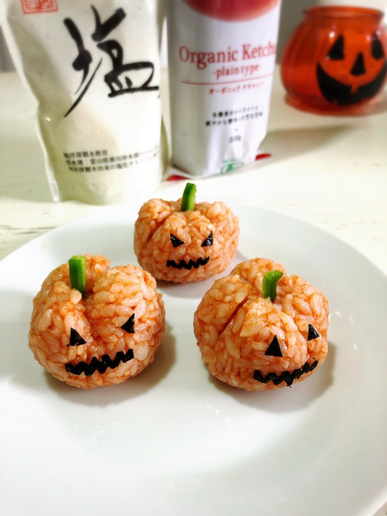 JUGEMテーマ:毎日の簡単1品 今日は〜ハロウィンおにぎり♪ それでは材料から〜 炊きたてご飯・・・適量 エサンテオーガニックケチャップ・・・適量 12ヶ月の食卓塩・・・少々 胡椒・・・少々 バター・・・少々 ピーマン・・・少々 海苔・・・少々 以上です! それではLet's cooking! ボールに適量のご飯と塩胡椒、ケチャップ、バターを 入れよく混ぜ合わせます。 ピーマンはジャックランタンの茎の...