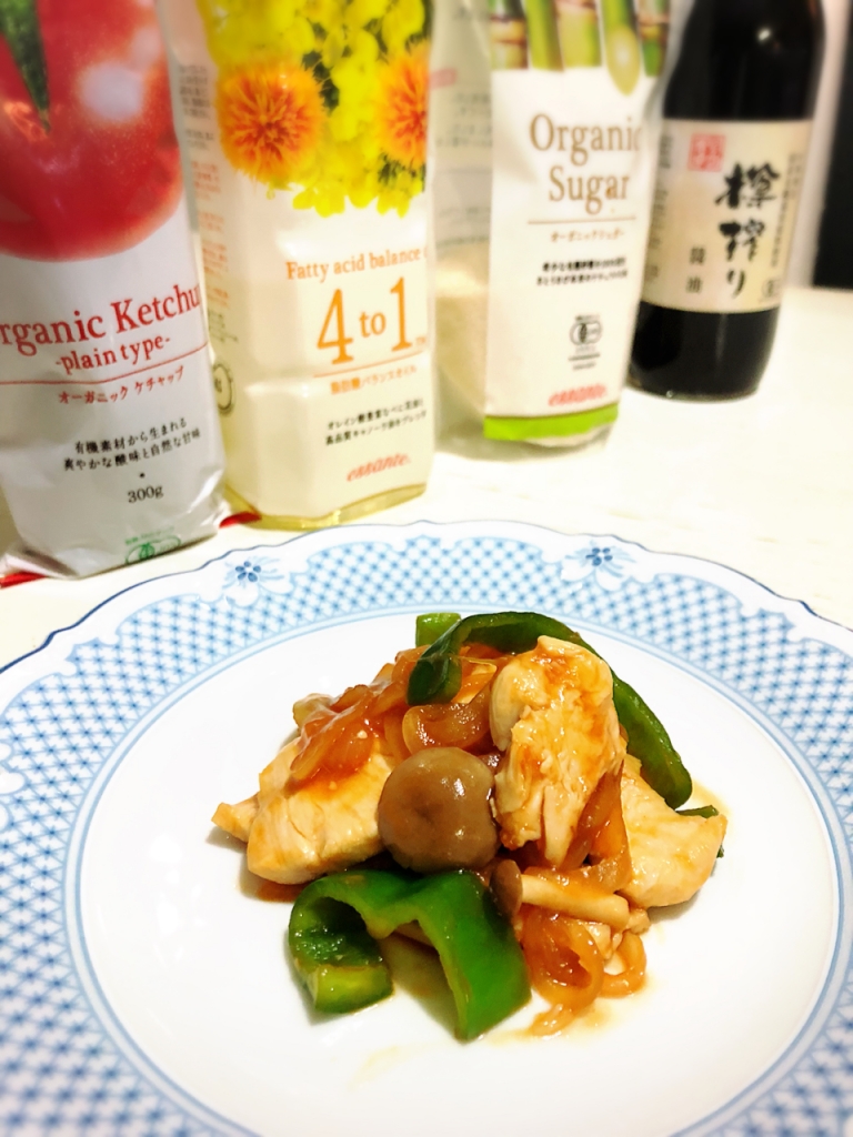 JUGEMテーマ:毎日の簡単1品 今日は〜鶏胸肉♪ それでは材料から〜 鶏胸肉・・・1枚(200g) ☆12ヶ月の食卓塩・・・少々 ☆エサンテオーガニックシュガー・・・小さじ1/2 ☆片栗粉・・・小さじ1/2 ☆浄水・・・大さじ1 玉ねぎ・・・1/2個 ピーマン・・・2個 しめじ・・・50g エサンテ4to1脂肪酸バランスオイル・・・小さじ2 ★エサンテオーガニックケチャップ・・・大さじ3 ★12ヶ月の食卓樽搾り醤油・・・小さじ1 ★みりん・・...