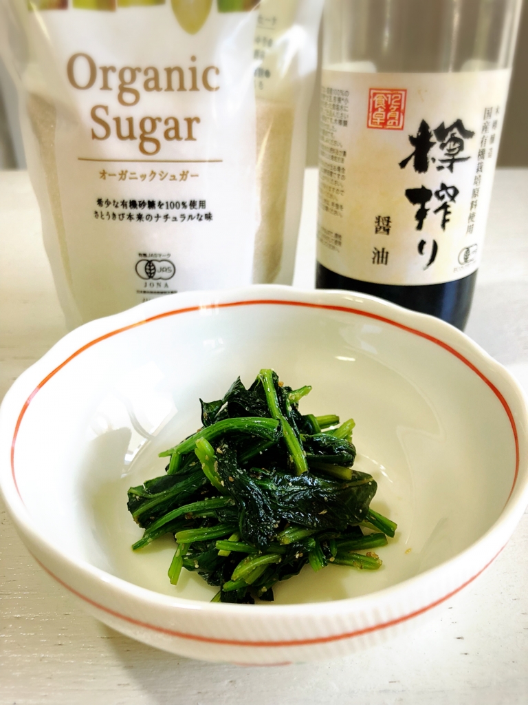 JUGEMテーマ:毎日の簡単1品 ーーーーーーーーーーーーーーーーーー ーーーーーーーーーーーーーーーーーー 今日はほうれん草♪ それでは材料から〜 ほうれん草・・・1袋 ☆生姜すりおろし・・・小さじ1 ☆白すりごま・・・大さじ1 ☆12ヶ月の食卓樽搾り醤油・・・小さじ2 ☆エサンテオーガニックシュガー・・・小さじ1 以上です! それではLet's cooking! &...