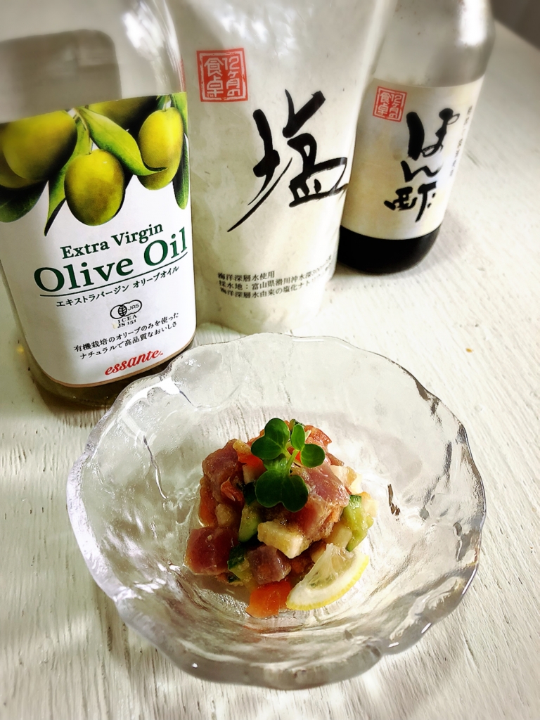 JUGEMテーマ:毎日の簡単1品 今日は〜まぐろと山芋とトマトと胡瓜♪ それでは材料から〜 刺身用まぐろ・・・150g(冊) 長芋・・・150g トマト・・・1/2個 胡瓜・・・1/2本 ☆エサンテオーガニックエキストラバージンオリーブオイル・・・大さじ3 ☆12ヶ月の食卓塩・・・少々 ☆胡椒・・・少々 ☆12ヶ月の食卓ぽん酢・・・大さじ2 ☆わさび・・・小さじ1/2 以上です! それではLet's cooking! 種を取ったトマトと、...