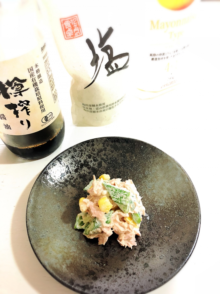 JUGEMテーマ:毎日の簡単1品 今日は〜トウモロコシとオクラ♪ それでは材料から〜 トウモロコシ・・・1/2本 オクラ・・・4本 ツナ缶・・・1缶 ☆エサンテマヨネーズタイプ・・・大さじ2 ☆12ヶ月んp食卓樽搾り醤油・・・小さじ1 ☆白すりごま・・・大さじ1 以上です! それではLet's cooking! トウモロコシは蒸して実を削いでおきます。 ※缶詰でもOKです♪ オクラは下処理をして茹でてヘタとガクを取り ...