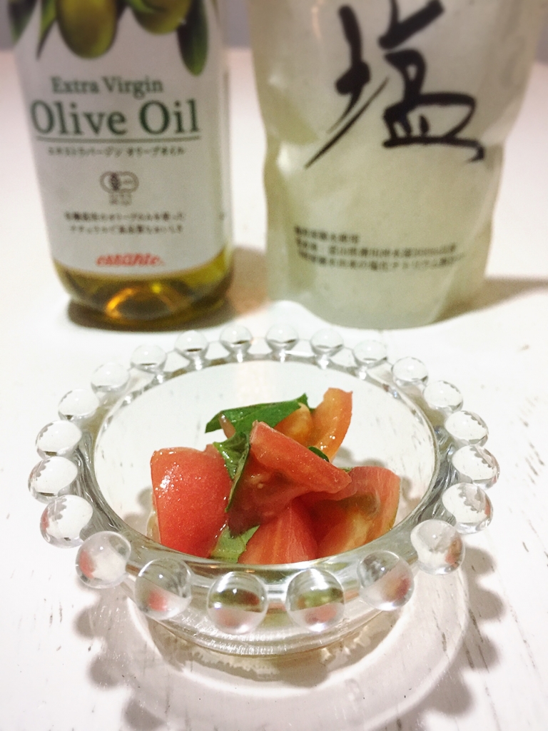 JUGEMテーマ:毎日の簡単1品 ーーーーーーーーーーーーーーーーーー ーーーーーーーーーーーーーーーーーー 今日は〜トマト♪ それでは材料から〜 トマト・・・1個 エサンテオーガニックエキストラバージンオリーブオイル・・・小さじ2 12ヶ月の食卓塩・・・小さじ1/2 バジル・・・2〜3枚 以上〜です! それではLet's cooking! トマトはざく切りにします。 ボ...