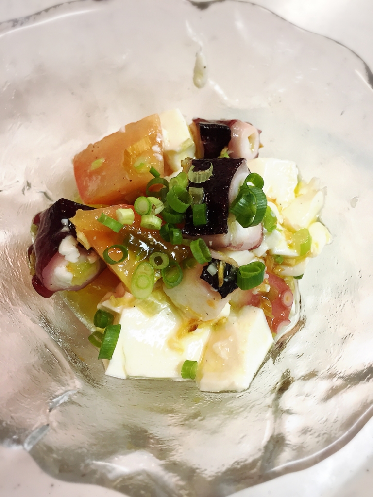 JUGEMテーマ:毎日の簡単1品 ーーーーーーーーーーーーーーーーーー <スポンサード> ーーーーーーーーーーーーーーーーーー 今日は〜タコとトマトと豆腐♪ それでは材料から〜 タコ・・・1〜2本 トマト(小)・・・1個 12ヶ月の食卓塩・・・少々 胡椒・・・少々 ☆ニンニクみじん切り・・・1/2片 ☆白ネギみじん切り・・・1/4本 ☆エサンテ4to1オーガニックエキストラバージンオリーブオイル・・・大さじ...