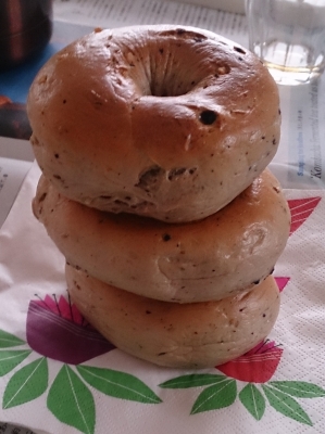 JUGEMテーマ:おうちカフェ くるみとドライブルーベリー入り ”30分で簡単ベーグルレシピ” を見つけたので。 何年かぶりにベーグルを作りました。 粉300gに塩少々と、砂糖20g、イースト6g お湯200ccを入れて10分こねて、形を作りベンチタイム10分。 はちみつを入れたお湯で表裏1分半づつ茹で、 200度のオーブンで15分焼く。 工程は簡単なのに、ちゃんとしたもっちりベーグルできました。 セモリナ粉100gと強力粉200で、クルミ入り。 セモリナはパスタに使われる粉ですが、コシ...