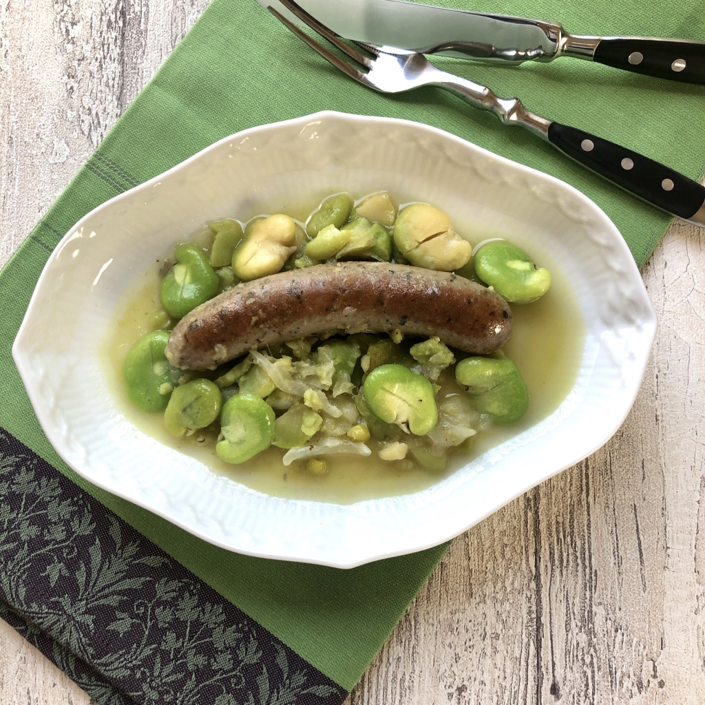 こんにちは。 美食とヘルシーを両立させる料理家、料理教室ル・プティ・フール 後藤初美です。 立夏を過ぎて、初夏の陽気になってきました。 (マスクをしてると暑い熱い) 冷蔵庫に買い置きしたものが色々あったので、昨日はそんなストックから。 *フリーザーにあったソーセージ(仔羊!) *新玉ねぎ半分 *大好きなそら豆 *少し残っていたスナップエンドウ 仔羊肉は脂肪が少ない上に、体を温めてくれる食材。 しかしこれからの季節は熱くなりすぎるとかえって...