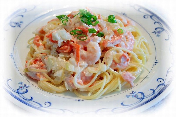 好きな「パスタ」なに? JUGEMテーマ:私の手料理 鮭が一切れとエビが少し残っていたので、大好きクリームパスタ。 あり合せの野菜も刻んで〜♪