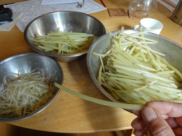 JUGEMテーマ:私の手料理 実家のキッチンガーデンはこの時期大量の蕗が茂ります。毎年これを摘み取って、保存用のきゃら蕗を作ります。蕗の下ごしらえの方法は3つ。1つ目はさっと茹でた後で皮を剥く方法、2つ目は茹でた後で布巾などで包んで転がしながらゴシゴシして、出てきた繊維を取り除く方法、3つ目は何もせずそのまま調理する方法で、今年の蕗は太くて固そうなので、皮むきすることにしました。一晩水に浸けてアク抜きするので、2日かけての大仕事が始まりました