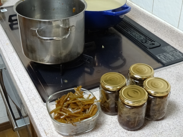 水に一晩浸けておいた蕗を今日は瓶詰めまで行います。 水切りした蕗をずん胴に入れ、お醤油とお砂糖、それに鷹の爪一本を入れて煮込みます。瓶詰め用のきゃら蕗は、完全に煮詰めずに、煮汁を残すようにします。ここで密封保存用の瓶を平底の鍋に入れ煮沸し、蓋も最後に熱湯に入れます。煮立っている鍋から瓶を取り出し、蕗を瓶いっぱいに入れ、煮汁を、てっぺんに隙間ができるところまで注ぎます。蓋を軽く締めてそれをまた平底鍋に戻し、また鍋がぐらぐらいうまで煮沸。それからまた鍋から瓶を取り出し、今度は完全に蓋を締めて、...
