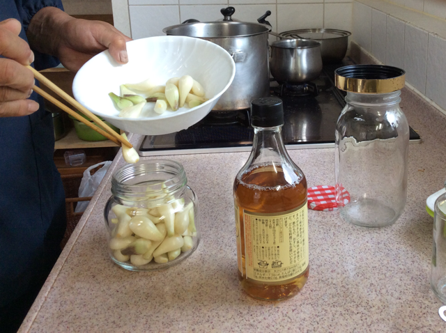JUGEMテーマ:私の手料理 農の会のKさんからラッキョウを頂きました。適当な保存瓶の準備などで日が開いてしまいましたが、ようやく甘酢漬け作りを開始しました。頂いたラッキョウは大き目なので下準備はあっという間に済み、それを瓶に詰め、酢にお砂糖が溶けた熱々の甘酢を掛けます。冷えたら暗所で保存し、数週間待ちます。ラッキョウは父親の大好物。上手くつかって欲しいものです