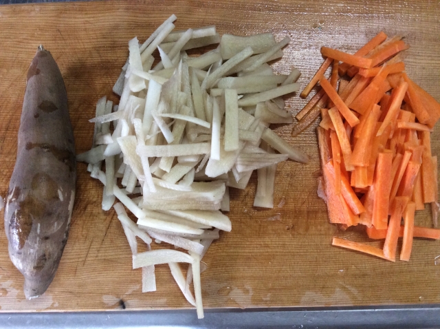 JUGEMテーマ:私の手料理 町田に戻る時には、父親の食事の作り置きをします。この冬はミニ冬瓜、カボチャ、里芋、それにヤーコンが食材として頑張ってくれました。今回はヤーコンのキンピラを作ります。材料は小野路産のヤーコンと鷹の爪、それに農の会のOさんから頂いた冬越しの人参。発泡スチロールに入れて保存しておいたヤーコンは全く劣化しておらず、今日も役立ってくれます。 鷹の爪の辛味を胡麻油に移してから粗く千切りにしたヤーコンと人参を炒め、醤油、砂糖、お酒を入れて煮こみます。父親のお気に入りの一品が出...