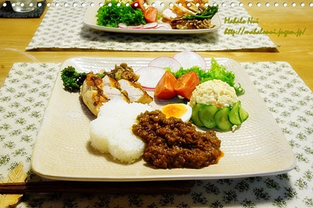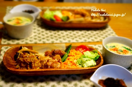 JUGEMテーマ:私の手料理 こんばんは。今日はご飯も比較的早く食べ終えたので、もう一つ更新しちゃいます。 お腹いっぱいではすぐに眠れないから・・・(^_^;) 今日は2日分一気に載せちゃいます。 毎日晩御飯考えるのって大変ですよね。あとは盛り付け・・・ どんなお皿に入れるか、どんな風に盛り付けるか。 決してセンスがいいとは言えない私。毎日あーでもない。こーでもないっと独り言、言いながら晩御飯の用意が始まります。 ランチョンマットを敷いてみたり、籠を使ってみたり、器を変えるだけでもずいぶん雰囲...