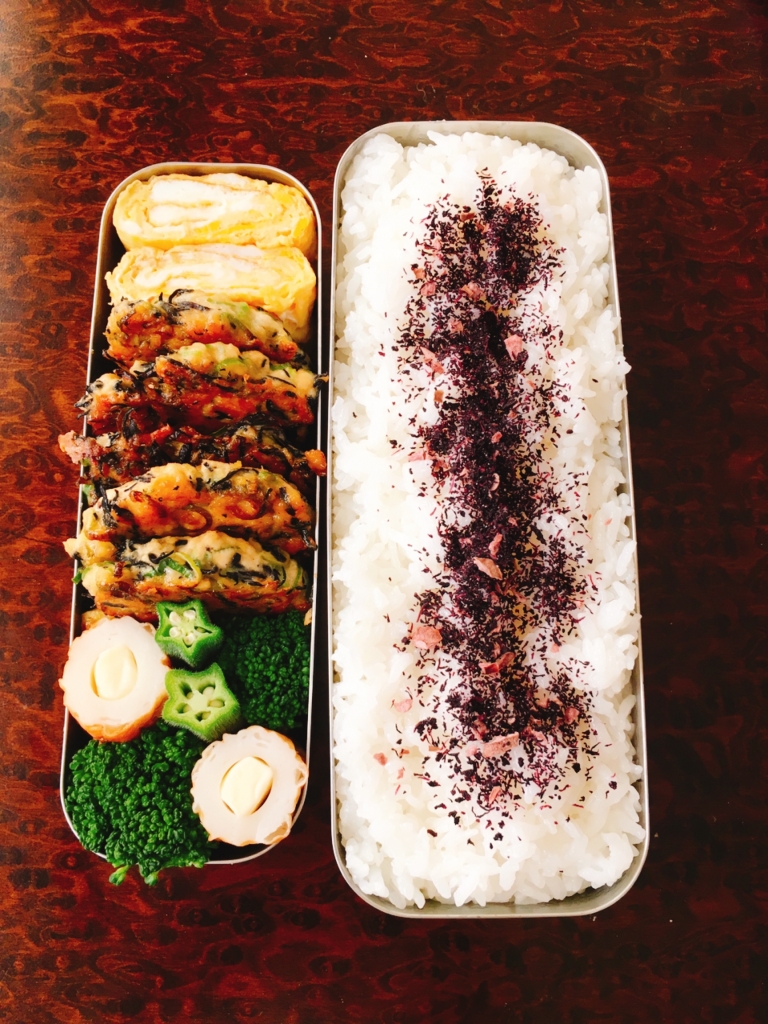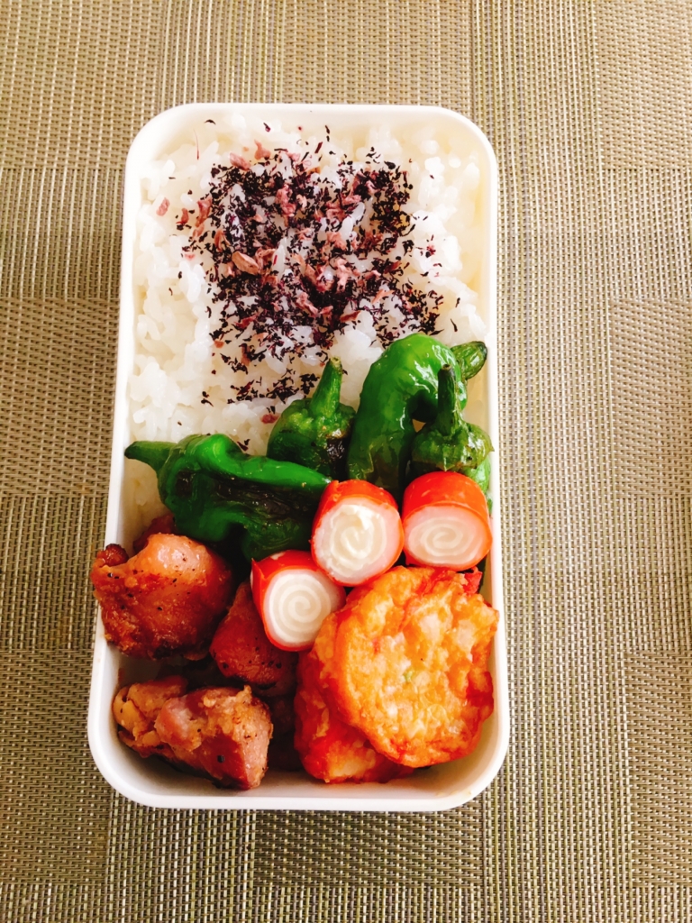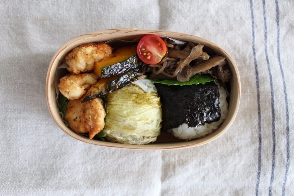 JUGEMテーマ:今日のお弁当 今日のお弁当 山椒ちりめんおぼろと梅海苔のおにぎり チキンの米粉塩唐揚げ かぼちゃの素揚げ 糸こんにゃくと牛肉牛蒡のピリ辛炒め プチトマト 。。。。。。。。 暦のうえでは秋になったんですね。今年は梅雨入りが遅くてまだ真夏の感覚ですが 日差しが少し秋に近づいているのを感じています 今日はがんばって揚げ物を作りました。。お弁当の定番ですね 冷めても美味しいです。 にほんブログ村 人気ブログランキング