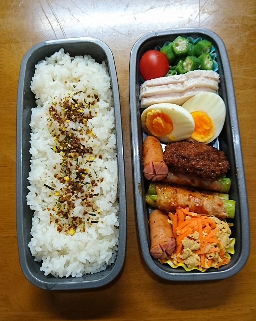 JUGEMテーマ:今日のお弁当 フネでございます。おはようございます! 今日は月曜日。 お盆休みも終わり、一週間が始まりました。 朝、起きるのが苦痛でしたが、頑張ってお弁当作りました。 入れ方が雑ですみませぬ💦 オクラの和え物、鶏もも肉ハム、アスパラの肉巻き、カツ(冷凍)、にんじんシリシリ。 お弁当食べて、今週も頑張りましょ〜! (カツオさん!あなたよ!) 50歳代ランキング