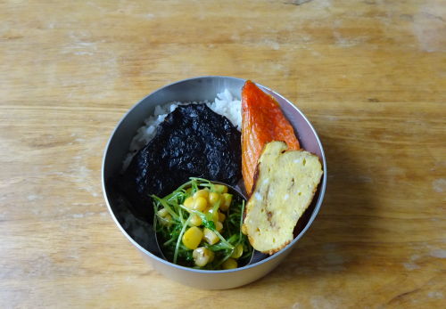 ・白米に ・海苔 ・焼鮭 ・玉子焼き ・豆苗とコーンの油いため をのせた。 朝ごはんver. JUGEMテーマ:今日のお弁当