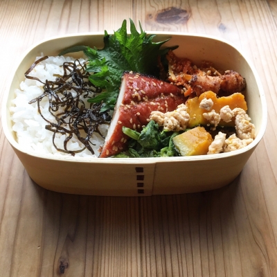 JUGEMテーマ:今日のお弁当 本日のわっぱ弁当です。 豚角煮と焼き塩鯖がメインなんだが かぼちゃの存在感よ 笑 昨晩はかぼちゃの炊いたんを作りました。 【昨日の晩ごはん】 ・鶏胸肉の塩麹バターソテー ・海老とホタテのハンバーグ ・かぼちゃの炊いたん ・わかめとカニカマの酢の物 ・豆腐と青さの味噌汁 ・いちご こっくり煮物系は 私が農家育ちで 子どものころから頻繁にしかも大量に食べてきたので 今と...