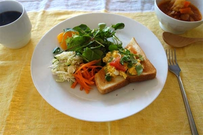 おはようございます。 今日は、梅雨入り前のカラリと晴れたイイ天気 体を動かすにはもってこいの天候です。 さっ、今朝は、クレソンのサラダ、春キャベツのコールスロー、 ふわとろ卵のオープンサンド、キャロットラペ、ミネストローネ。 珈琲は、ブレックファーストブレンド(6月限定)をセレクト!! 目覚めの一杯に最適です(^^) HAVE A NICE WEEKEND ;-) JUGEMテーマ:今日の朝ごはん